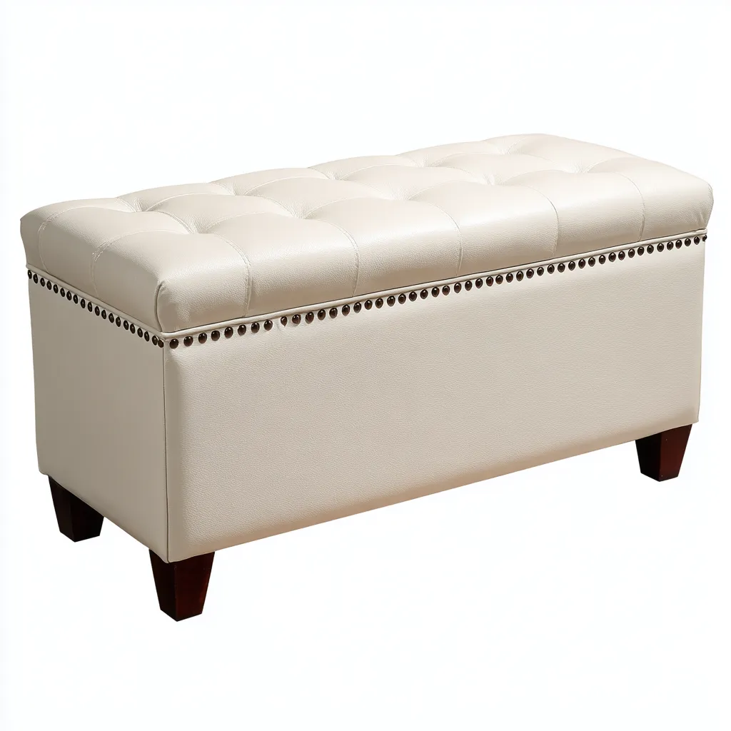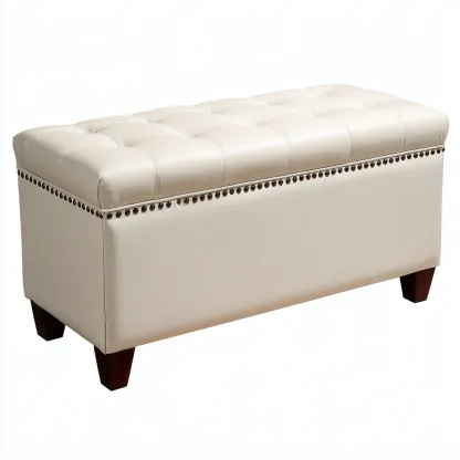 El banco está fabricado con cuero sintético blanco y patas de madera oscura, ofreciendo un estilo clásico y elegante.