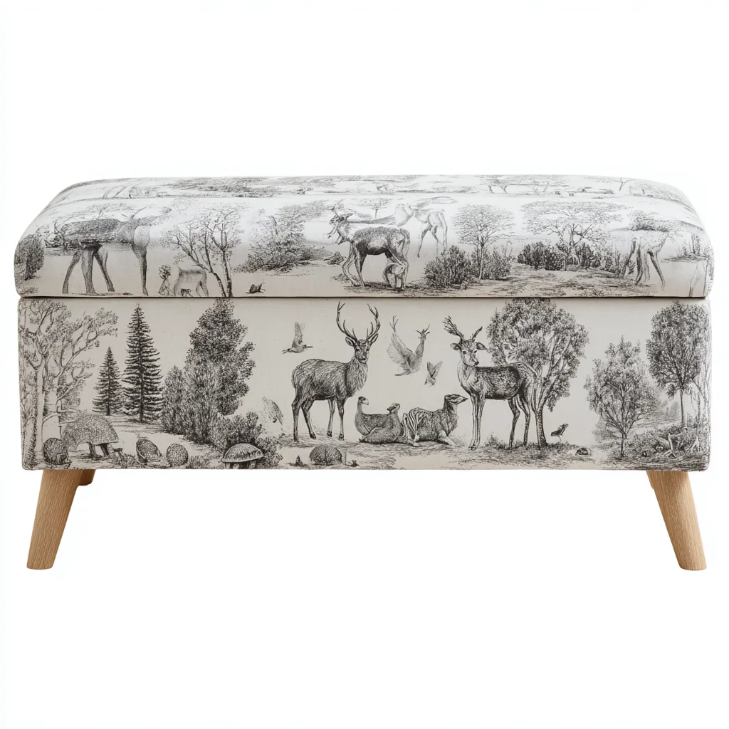 Este banco de dormitorio individual combina un estilo decorativo con un tapizado ilustrado que aporta un ambiente natural al espacio.