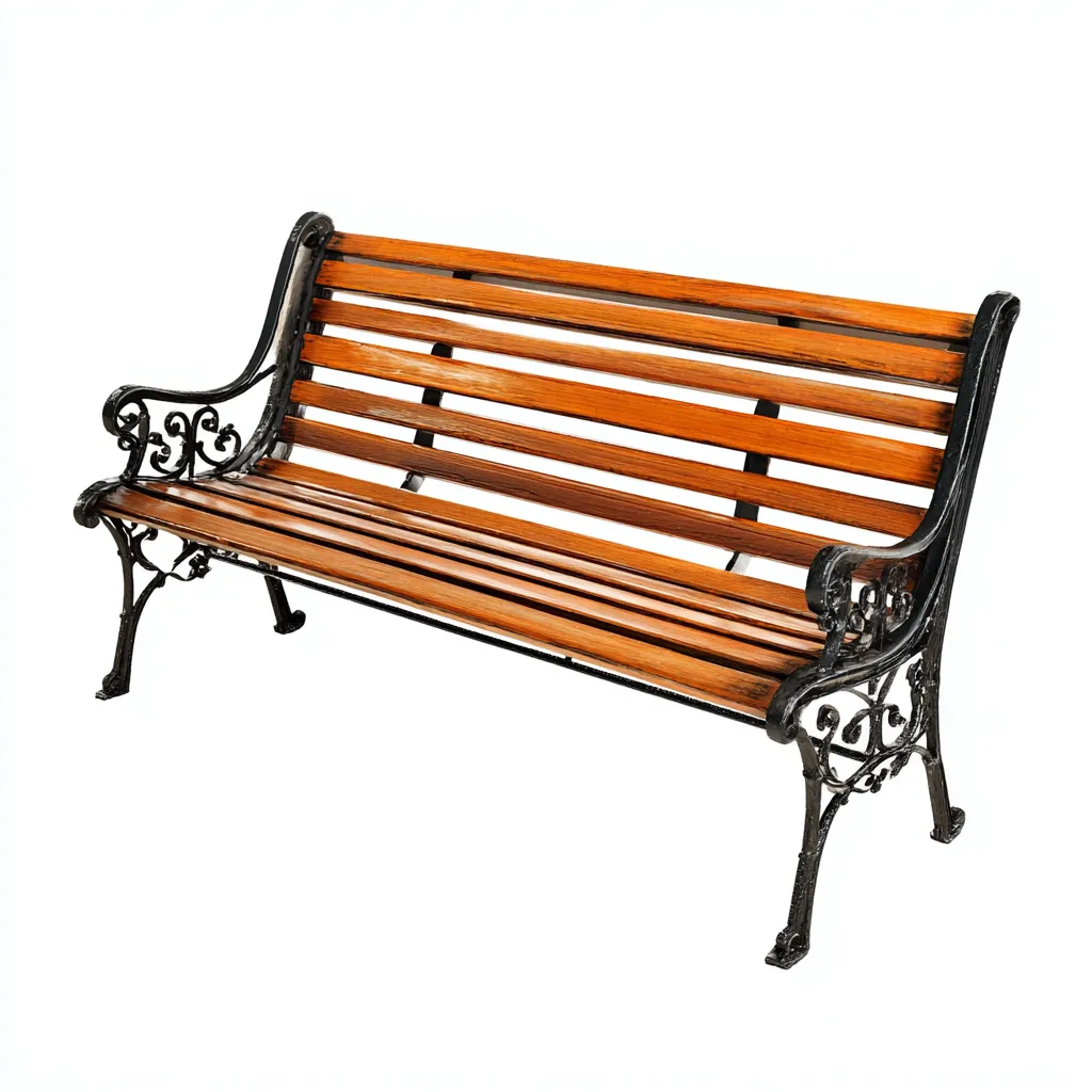 El asiento y el respaldo están fabricados con listones de madera de acabado liso, mientras que los laterales y las patas de hierro fundido aportan estabilidad y un estilo decorativo con detalles curvados.