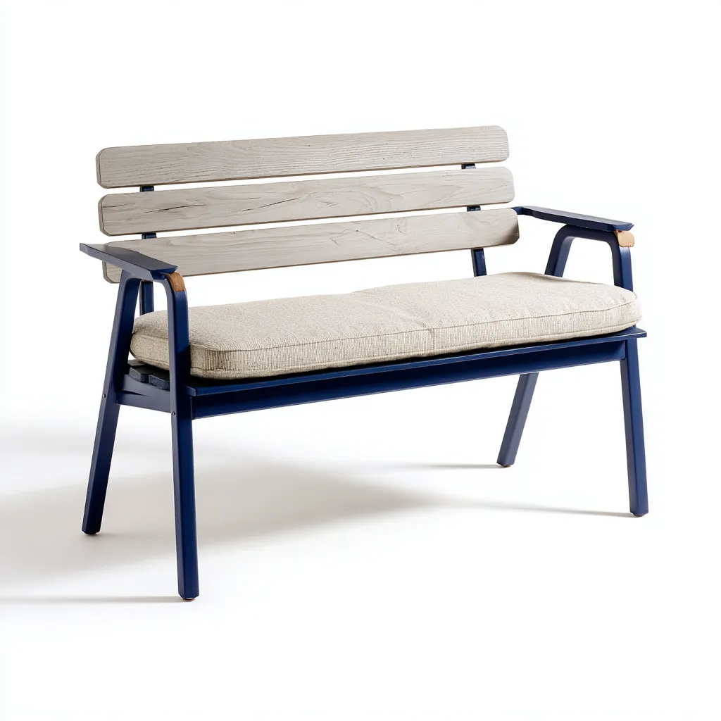 Este banco de jardín combina una estructura metálica azul marino con un respaldo de lamas en color gris y un cojín beige cómodo y resistente, ideal para su uso en terrazas, patios y jardines.