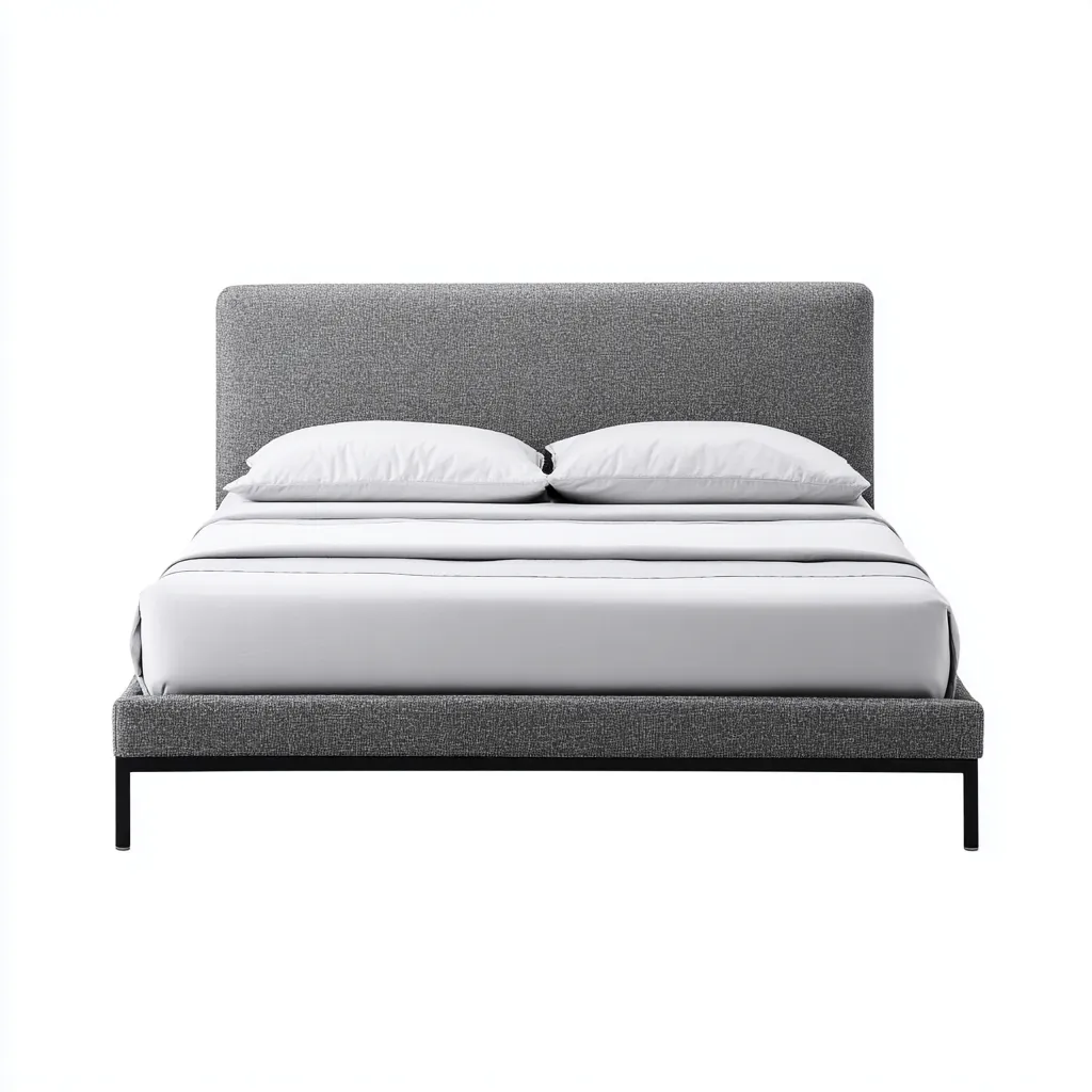 Esta cama matrimonial tapizada presenta un diseño contemporáneo con líneas rectas y una estética limpia, ideal para dormitorios modernos. Su estructura estilizada aporta una sensación visual ligera sin comprometer la estabilidad.