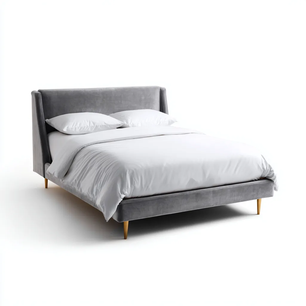 Esta cama matrimonial tapizada presenta un diseño moderno y estilizado, ideal para dormitorios actuales. Su silueta limpia y el cabecero ligeramente inclinado aportan una apariencia elegante y confortable.