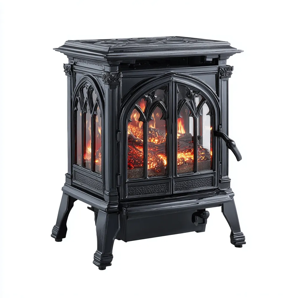 La unidad está fabricada completamente en metal en color negro, con detalles ornamentales que recuerdan a las estufas tradicionales. El acabado ofrece una alta durabilidad y una apariencia elegante.