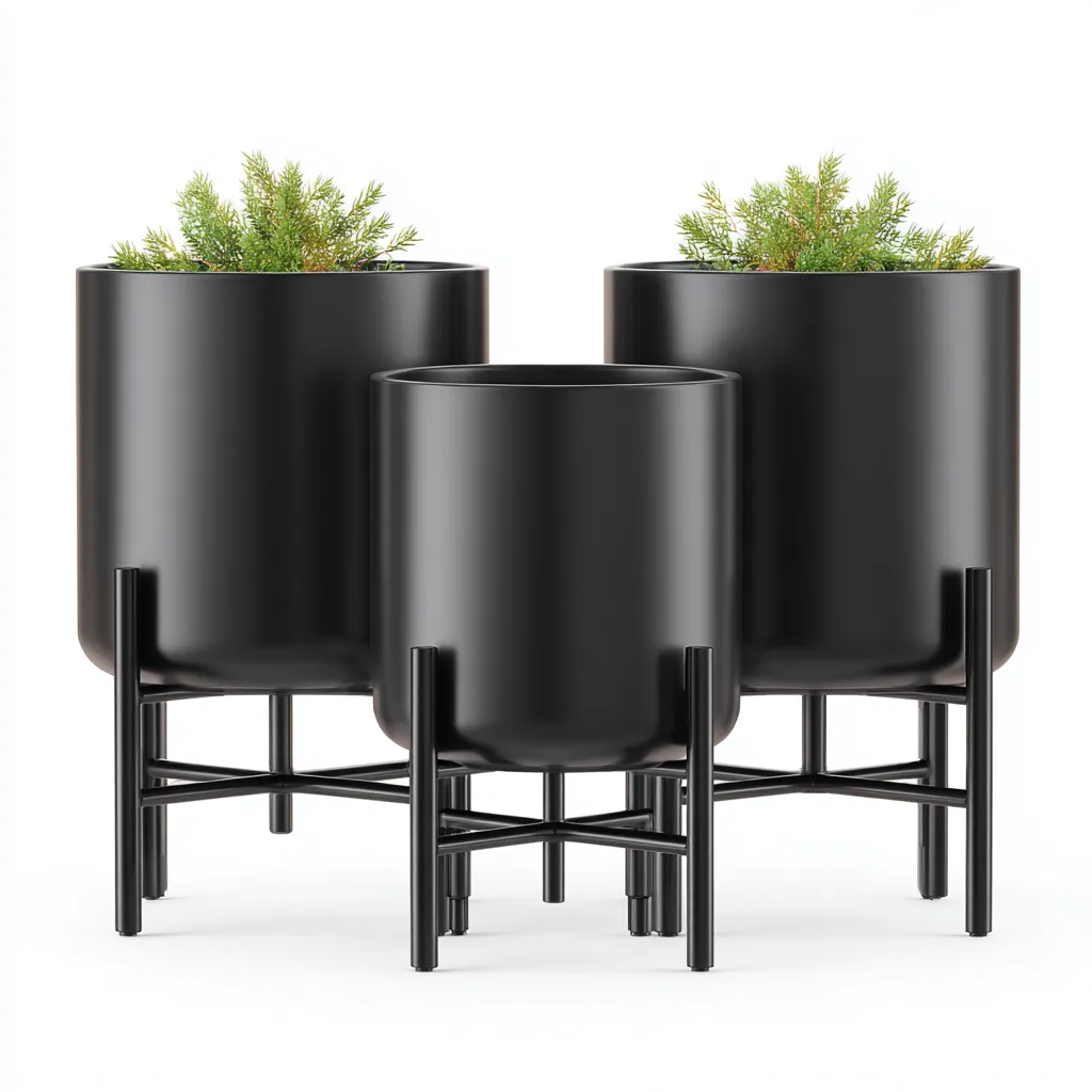 Este set de macetas con soporte está diseñado para realzar la presentación de plantas en interiores o jardines. Su estética moderna y su estructura elevada permiten crear composiciones decorativas equilibradas y atractivas.