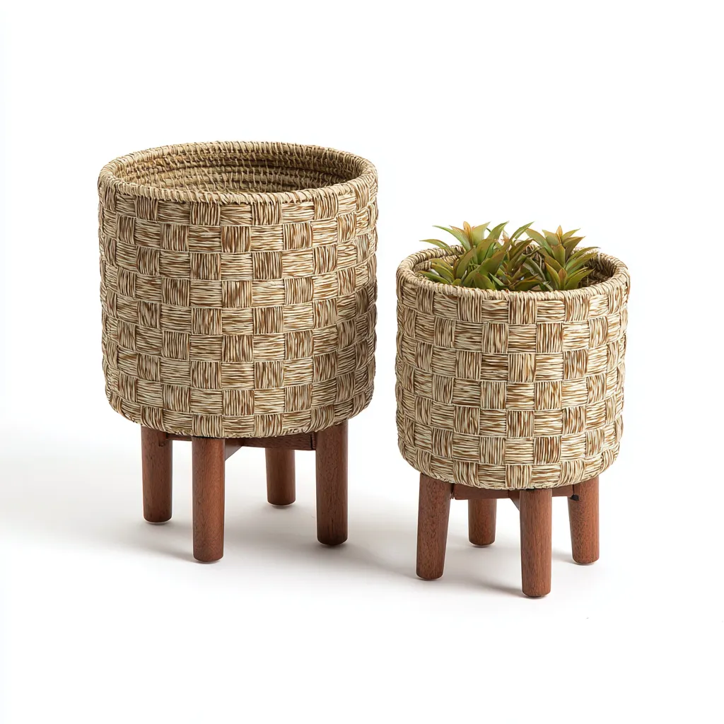 La maceta presenta un tejido de mimbre en tonos beige y marrón, mientras que el soporte está formado por patas de madera resistentes. La combinación de materiales proporciona estabilidad y una estética artesanal.