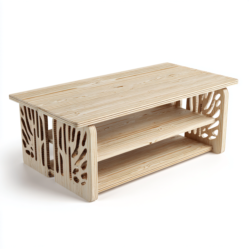 Esta mesa de centro presenta un diseño artístico inspirado en formas orgánicas, con paneles laterales calados que aportan carácter y una identidad visual única al salón.