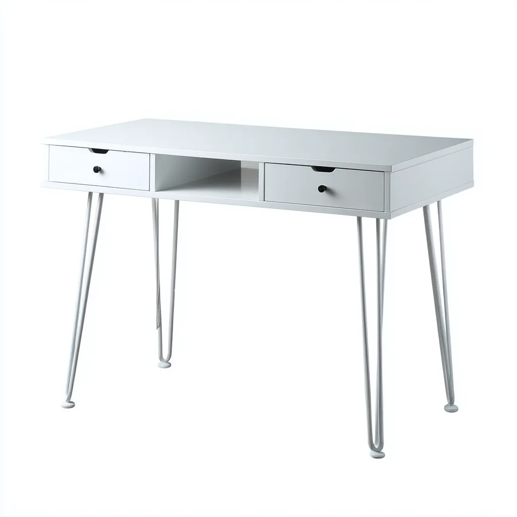 El tablero está fabricado en madera en color blanco con un acabado liso y resistente. Las patas metálicas estilizadas proporcionan estabilidad y un aspecto moderno, armonizando con el diseño minimalista del escritorio.