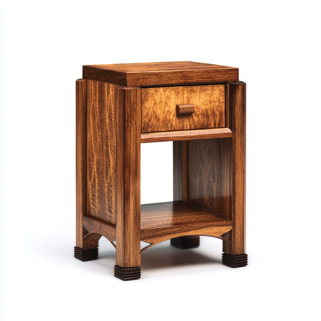 Esta mesita de noche de estilo retro destaca por su estructura elevada y líneas decorativas, aportando un toque cálido y elegante al dormitorio.