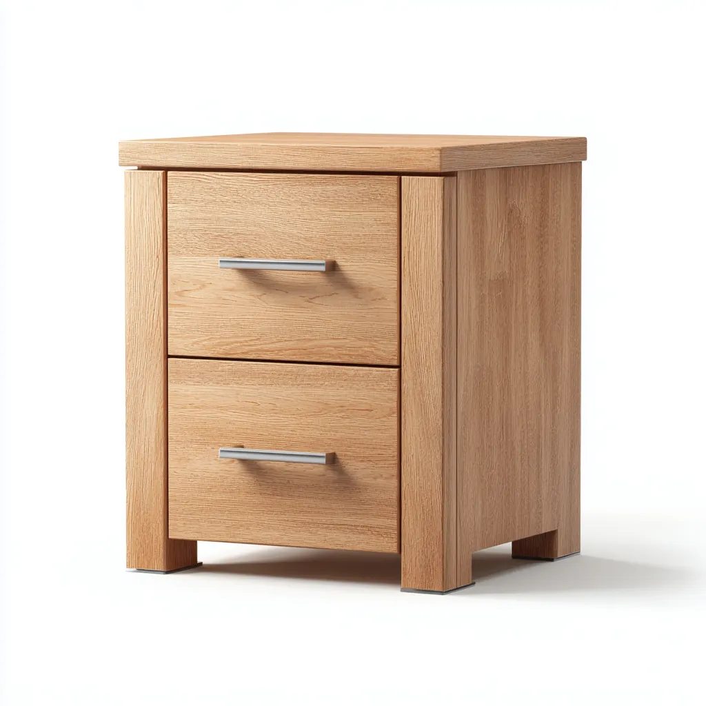 Mesita de noche de estilo minimalista, elaborada en madera de acabado marrón claro con líneas limpias y apariencia moderna.