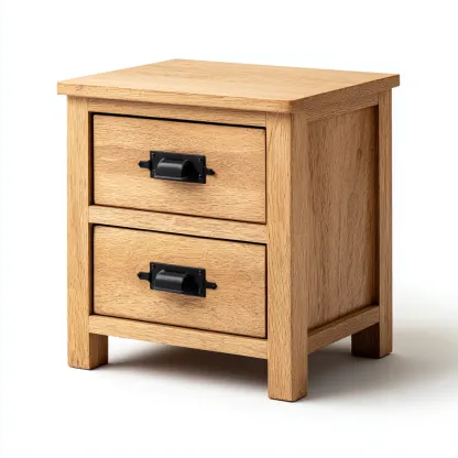 Mesita de noche de estilo rústico compacto, fabricada en madera de tono marrón claro con líneas rectas y estructura sólida.
