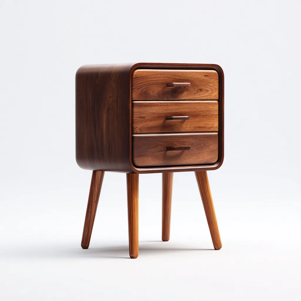 Mesita de noche de diseño nórdico con líneas suaves y bordes redondeados, fabricada en madera sólida y presentada en un tono marrón natural.