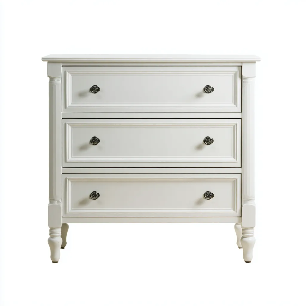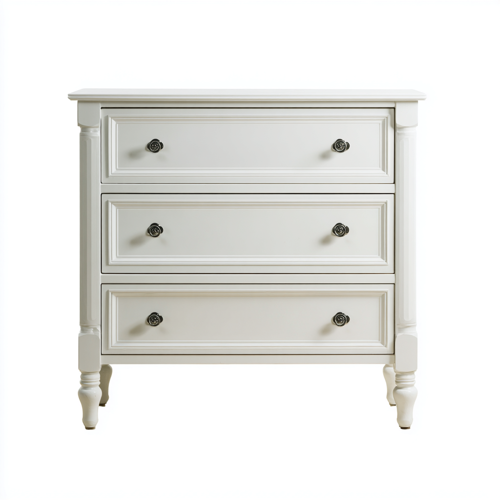 Construida en madera con superficie lacada en blanco y tiradores metálicos ornamentados que realzan su presencia decorativa.