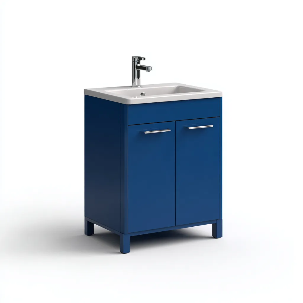 El cuerpo está fabricado en tablero aglomerado con acabado en color azul básico, combinado con un lavabo blanco de superficie lisa y de fácil mantenimiento.