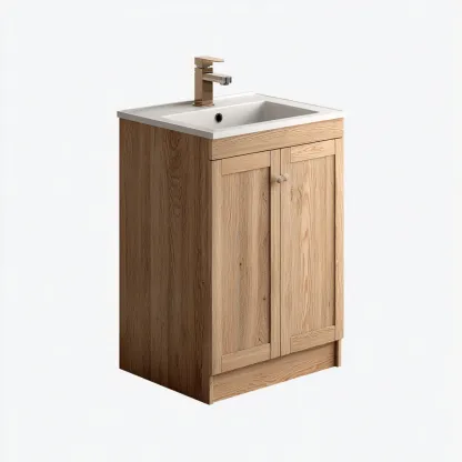 El cuerpo está fabricado en tablero aglomerado con acabado en color marrón, combinado con un lavabo blanco de superficie lisa y fácil mantenimiento.