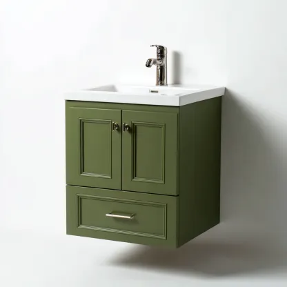 Este mueble de baño suspendido presenta un estilo clásico con líneas decorativas y una estructura sólida, ideal para quienes buscan un diseño tradicional con funcionalidad moderna. Su acabado en verde oliva aporta carácter y combina perfectamente con diferentes ambientes de baño.