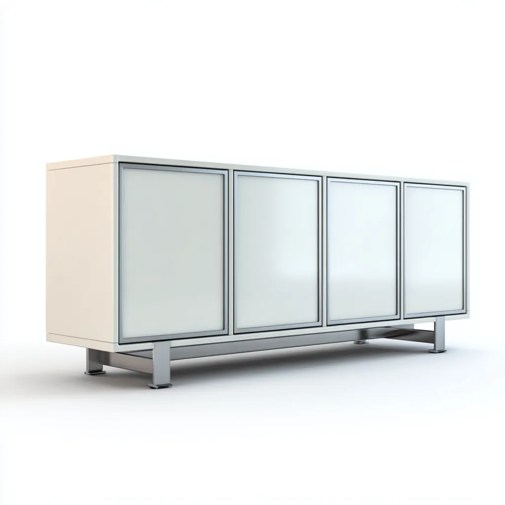 El cuerpo principal está fabricado en tablero de madera con acabado liso en color blanco. Las puertas individuales presentan un diseño limpio y discreto. La base metálica eleva el mueble, aportando estabilidad, resistencia y un estilo contemporáneo adecuado para diferentes ambientes.