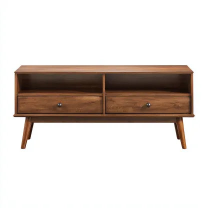 El mueble integra dos compartimentos abiertos ideales para dispositivos electrónicos que requieren ventilación. Además, cuenta con dos cajones inferiores que permiten almacenar accesorios del salón de forma discreta. La estructura elevada facilita la limpieza del área inferior.