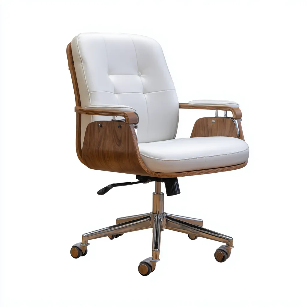Esta silla de oficina combina un tapizado en cuero sintético blanco con un acabado exterior en madera marrón, ofreciendo comodidad y una estética moderna para espacios de trabajo en el hogar o la oficina.