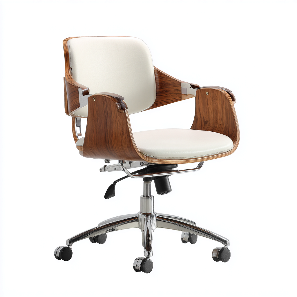 Esta silla de oficina de diseño moderno combina una estructura de madera curvada con un asiento y respaldo acolchados en piel sintética blanca, creando una estética elegante adecuada para oficinas, estudios y zonas de trabajo doméstico. Su forma envolvente proporciona comodidad y soporte durante el uso diario.