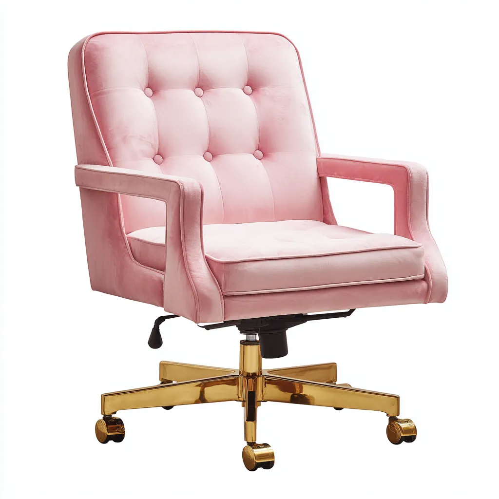 El tapizado de terciopelo rosa aporta una textura suave al tacto, mientras que la base metálica en acabado dorado proporciona resistencia y un aspecto visual moderno. Los materiales están seleccionados para garantizar durabilidad en el uso diario.
