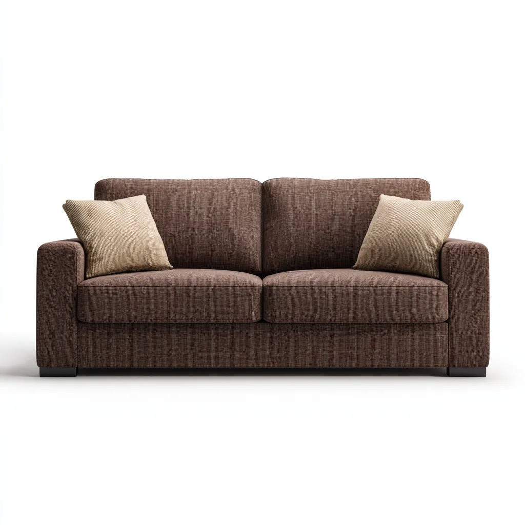 El tapizado en tela marrón presenta una textura uniforme y resistente. La base y los soportes inferiores cuentan con un acabado en madera oscura que aporta estabilidad y un aspecto sobrio.
