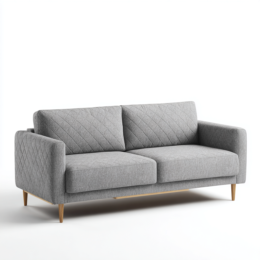 El tapizado en tela gris ofrece una textura suave y uniforme Las patas en madera clara proporcionan estabilidad y un contraste visual cálido
